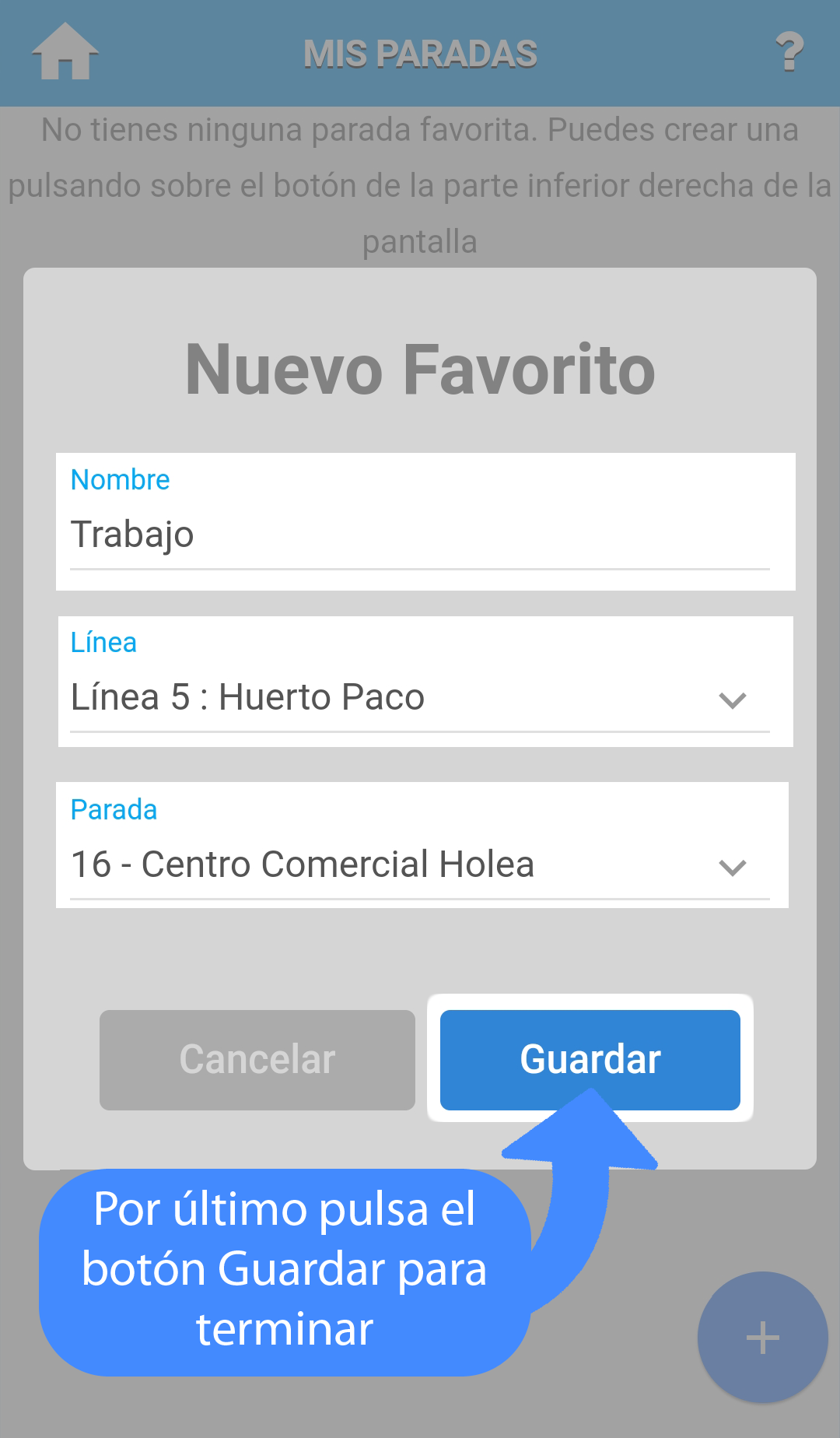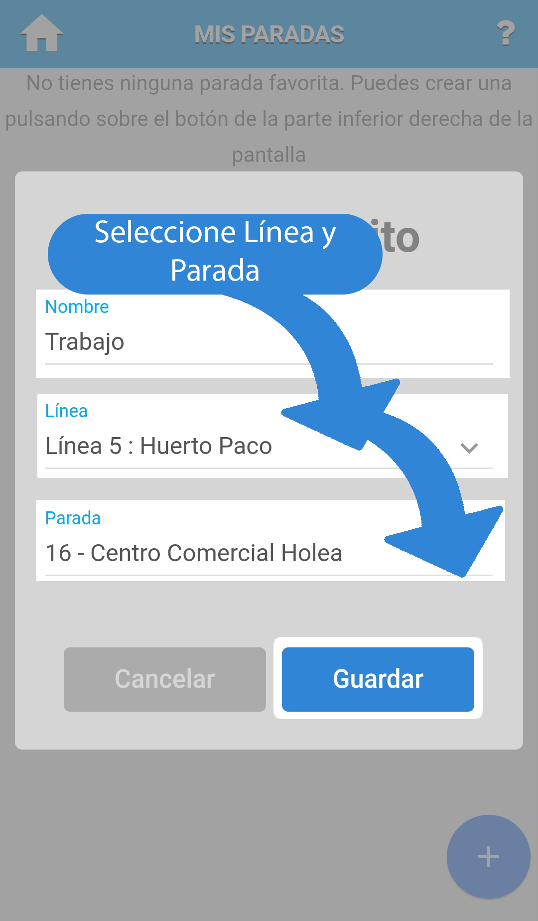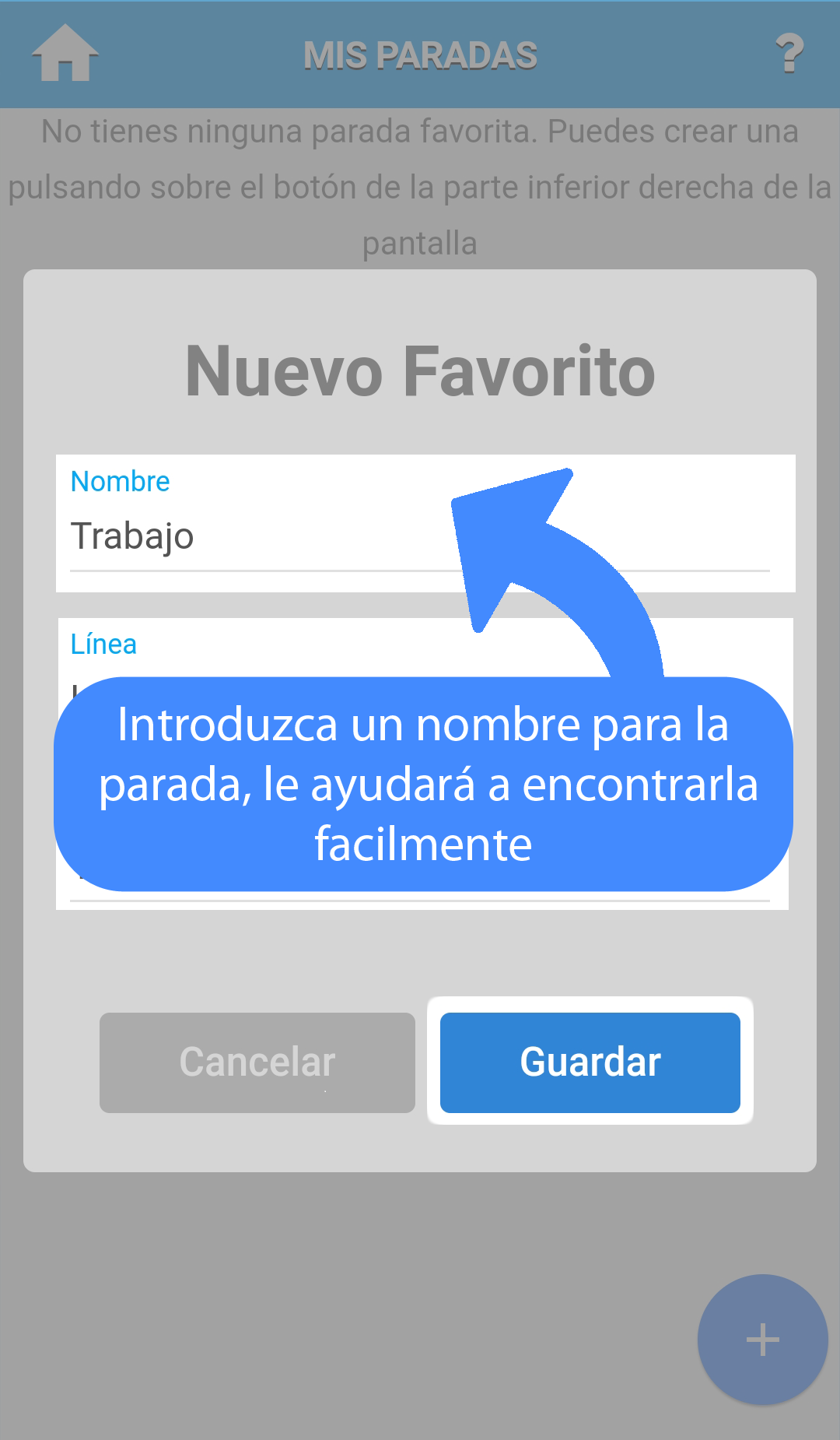 Permite crear, editar y ver paradas guardadas como favoritas.
